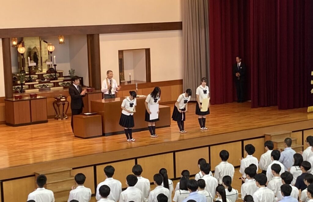 全校生徒を前に、陸上競技部と吹奏楽部の表彰が行われました。