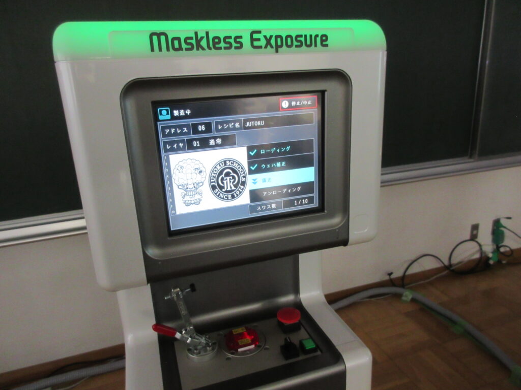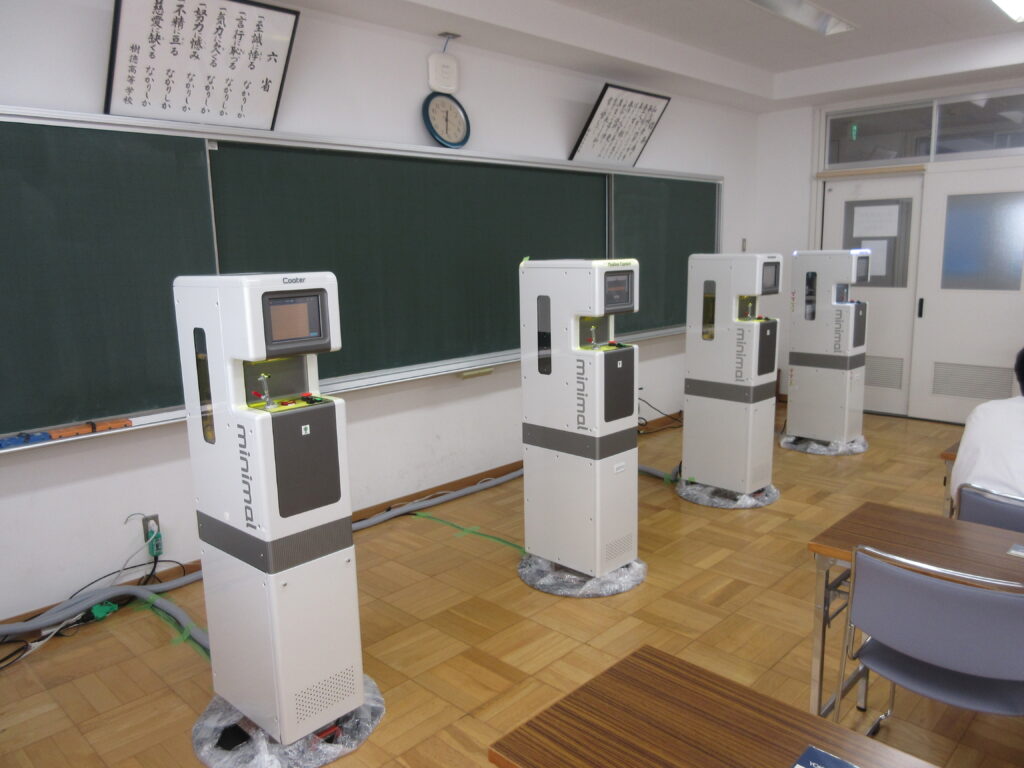 横河ソリューションサービス(株)より半導体製造装置「ミニマルファブ」を借用し、講義・実習を行いました。このミニマルファブは1台数千万円もする高価なもので半導体製造工程によりそれぞれ違う装置とのことで、その中の4台を設置していただきました。