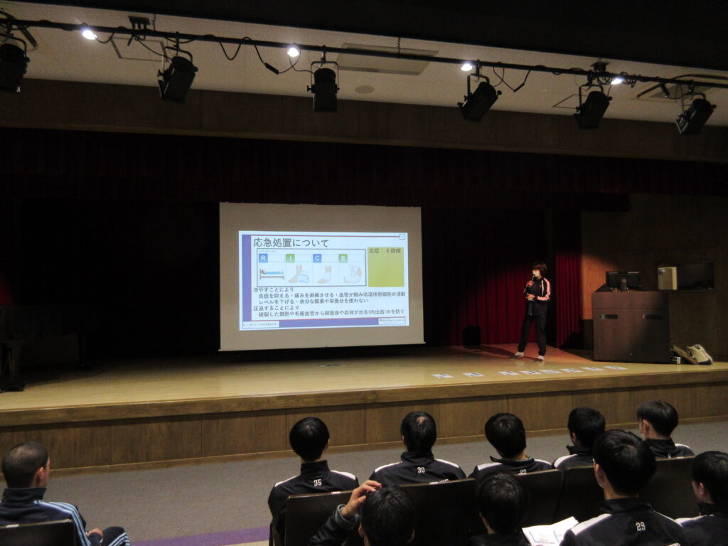 当日は、群馬医療福祉大学リハビリテーション学部の理学療法士 柴 ひとみ先生より「安全対策入門Ⅰ」の講義がありました。参加した強化指定部(野球・男子バスケットボール・柔道・相撲・男女陸上競技・男女卓球・吹奏楽)の生徒達は、柴先生の指導で痛みや怪我に至るメカニズムとその予防法、そして万一の時の応急処置法を学びました。その後、安全対策への第一歩として、自分の身体の柔軟さを知るためのトレーニングを実践しました。安全の意識を高め、来年は飛躍の年にしようと参加者全員でこころを一つにして、今年最後の講義を終えることができました。