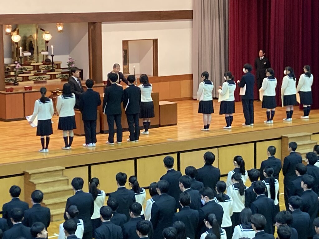 全校生徒を前に、男子バスケットボール部・陸上競技部・ダンス部・吹奏楽部・家庭科部・写真部・美術部、および個人の表彰が行われました。