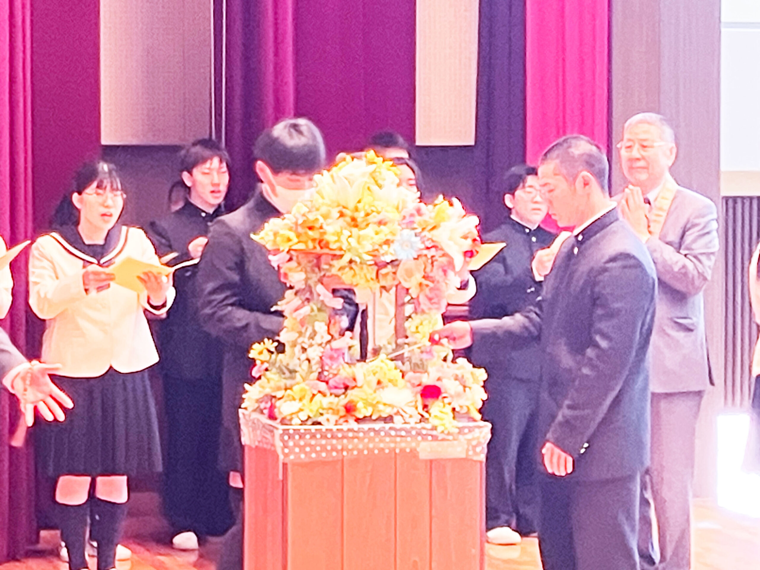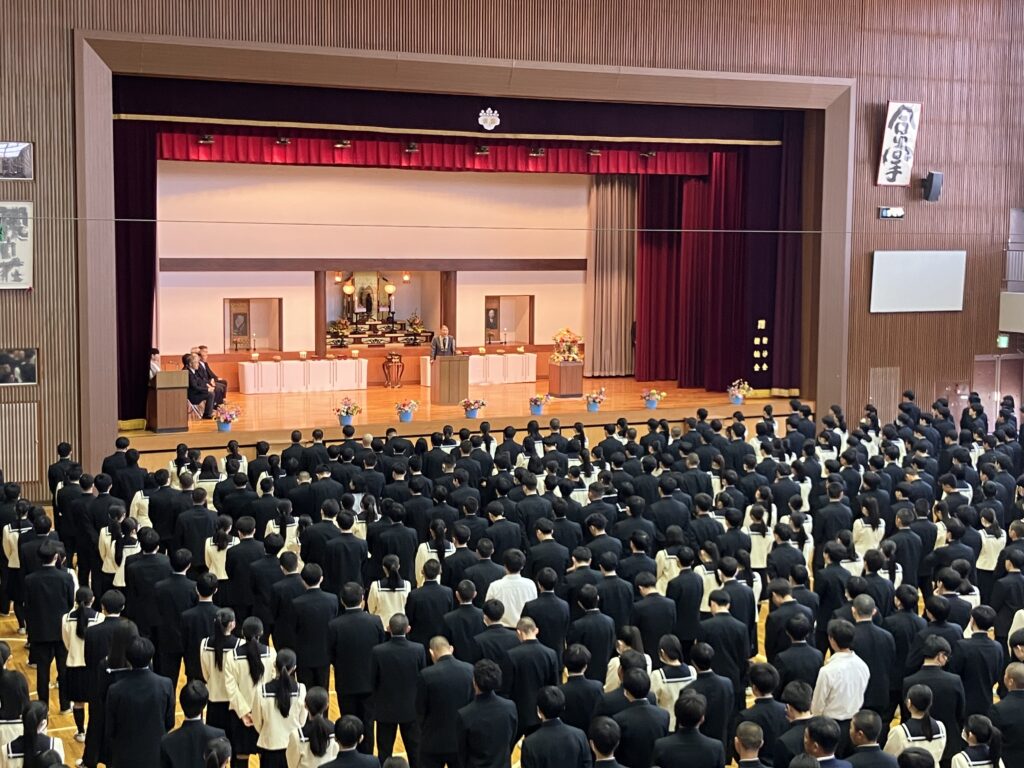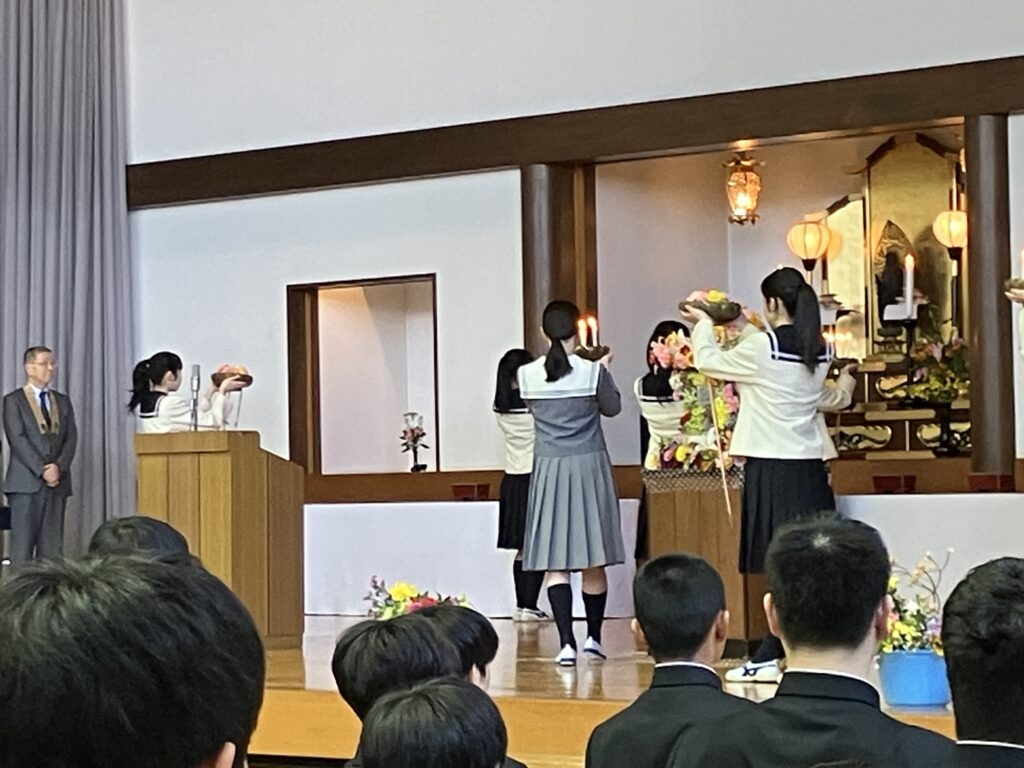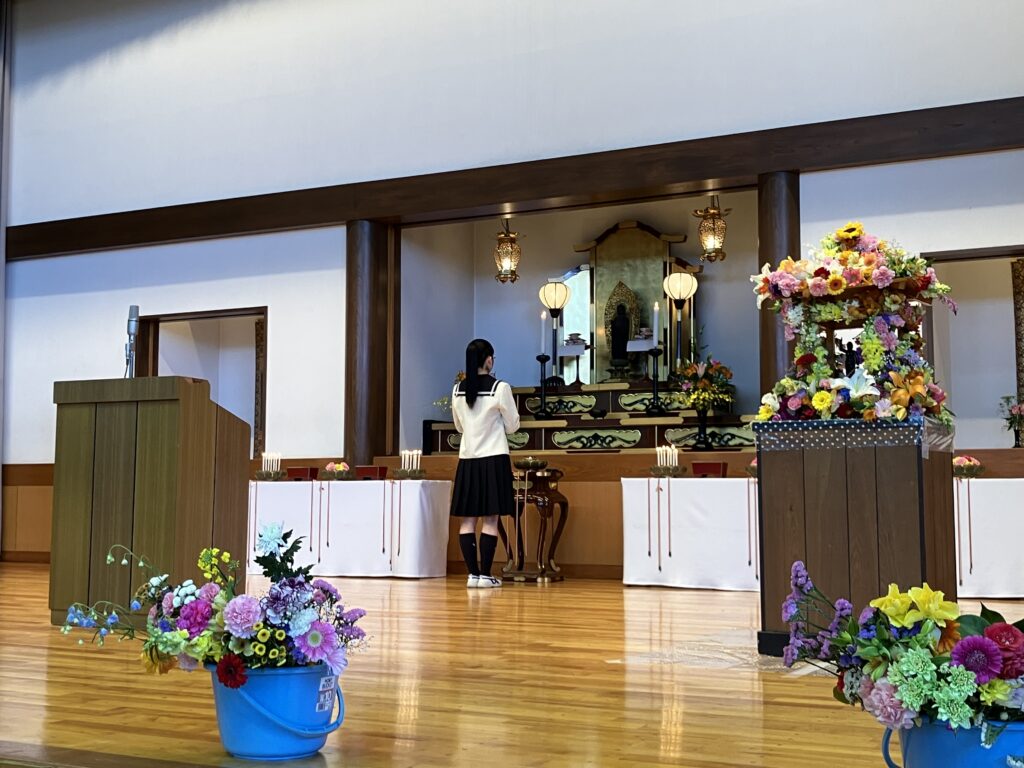 新入生を迎えて、全校生徒が講堂に集まり花まつり・対面式が行われました。献香・灌仏のあと、新入生と上級生の代表生徒が言葉を掛け合い、向かい合って握手をしました。
