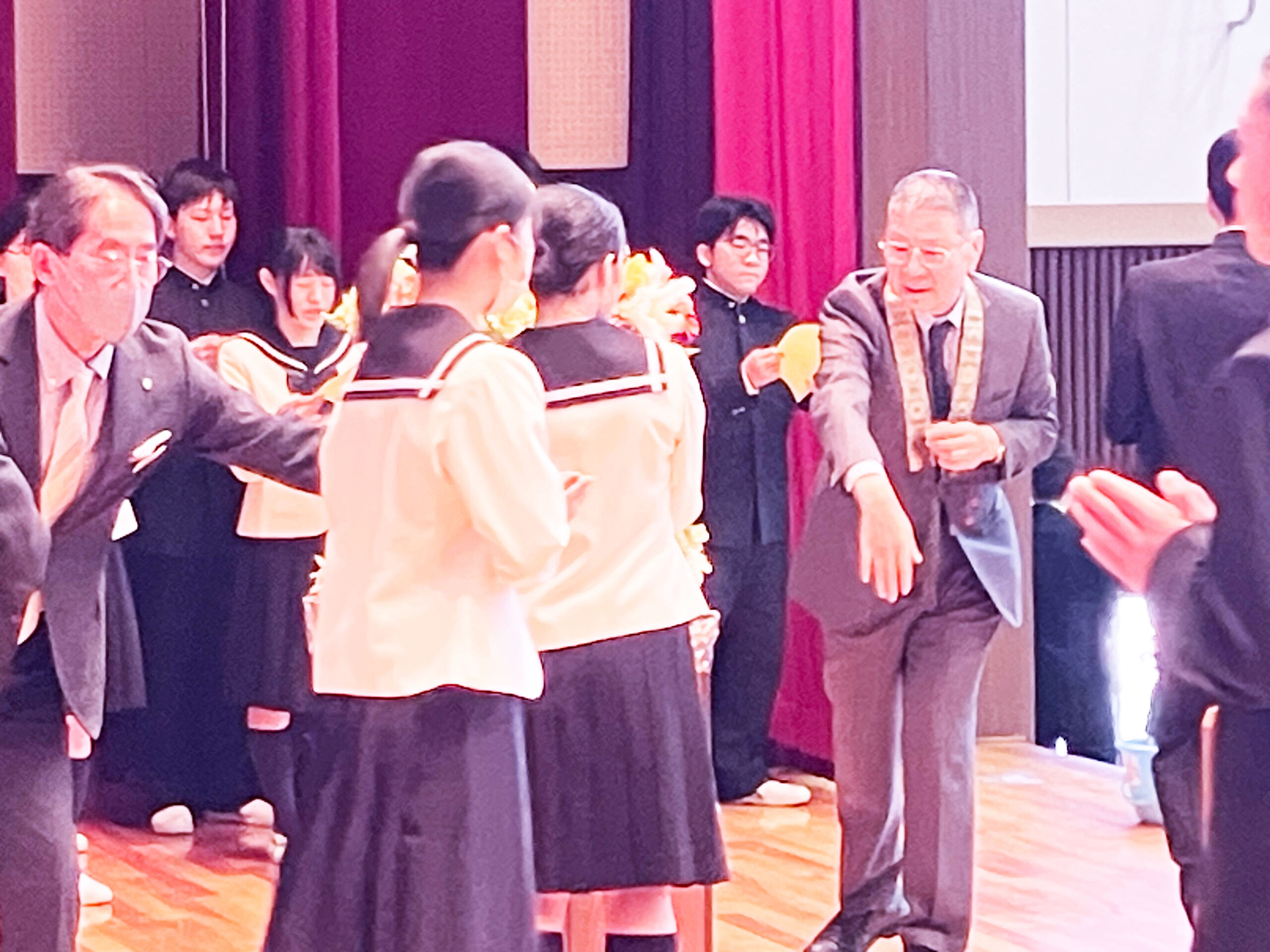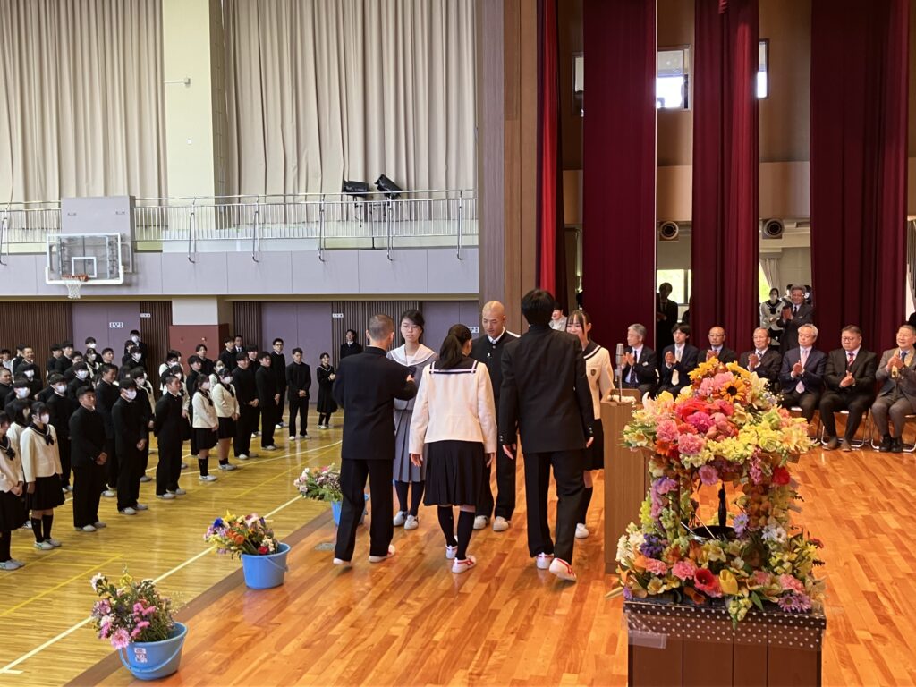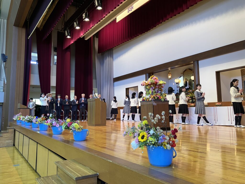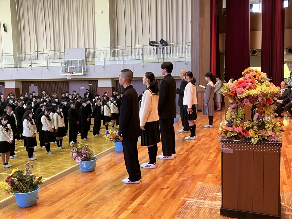 新入生を迎えて、全校生徒が講堂に集まり花まつり・対面式が行われました。献香・灌仏のあと、新入生と上級生の代表生徒が言葉を掛け合い、向かい合って握手をしました。