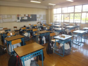 10月2日(木)3時限と4時限の間の休み時間に、地震を想定した避難訓練が行われました。地震はいつどこで発生するかわからない。地震が発生したときに、自分の身を守るためにベストな避難行動をとれるようにすることが大切です。今回の避難訓練は、休み時間で生徒がいろいろな場所にいるという設定で行いました。この実践を実際に地震が起きたときに役立ててほしいです。
