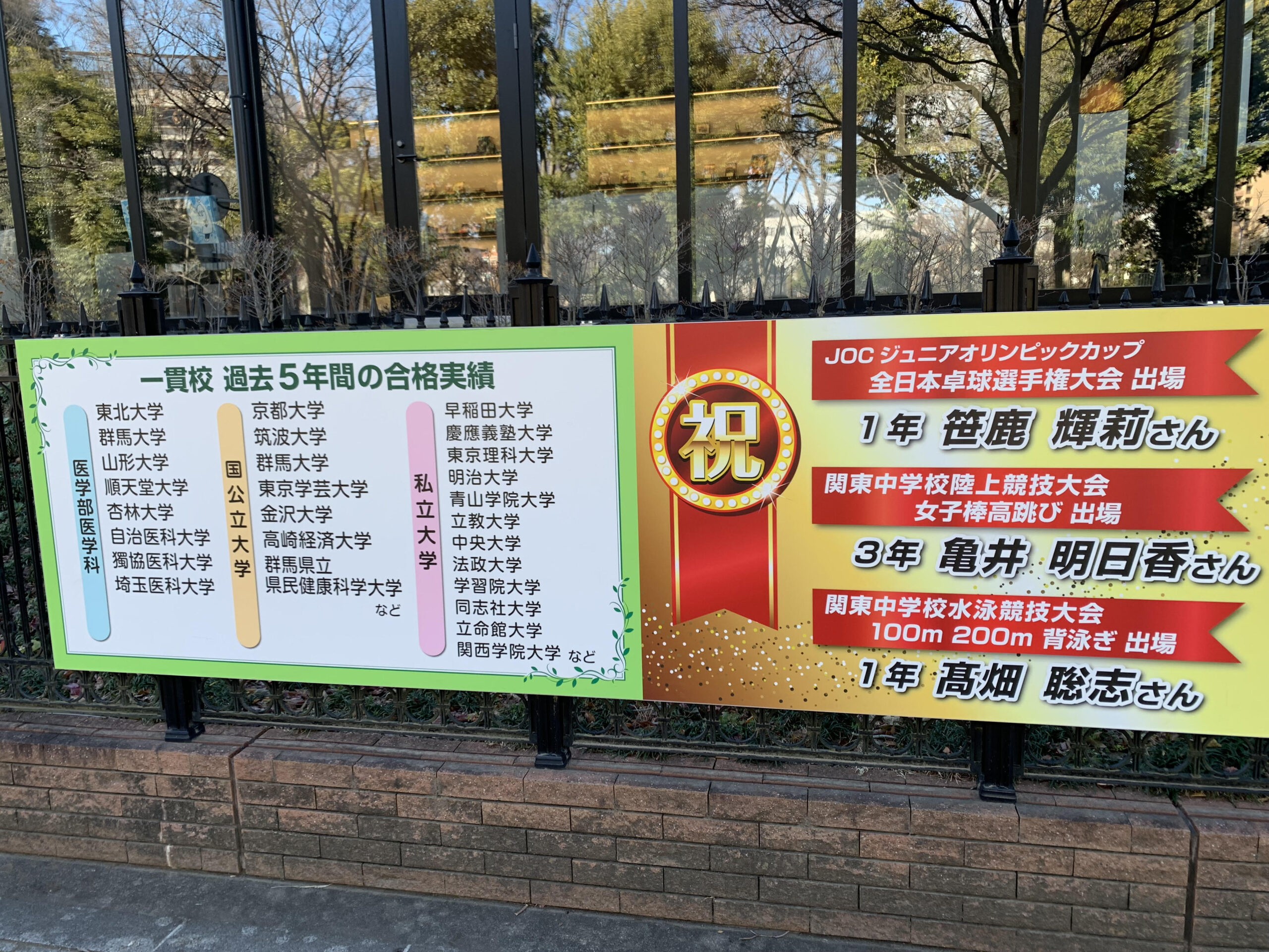 共生図書館前に新看板が設置されました。過去5年間の一貫校の進路実績(医学部医学科・国公立大学・私立大学)と今年度の部活動等における関東大会以上の参加実績が掲載されています。これからも一貫校の生徒が多方面で活躍してくれることと思います。