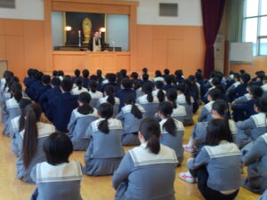 12月24日(水)中学棟講堂で第2学期終業式が行われました。学校長から、「時間はみんなの共有財産」という話がありました。具体的には「自分が時間を守らなければ、他人に迷惑をかけることになる。三学期からはチャイムや放送設備もリニューアルされる。5分前行動を意識して生活してほしい。」という内容でした。 生徒たちの3学期からの行動にいかされることと思います。