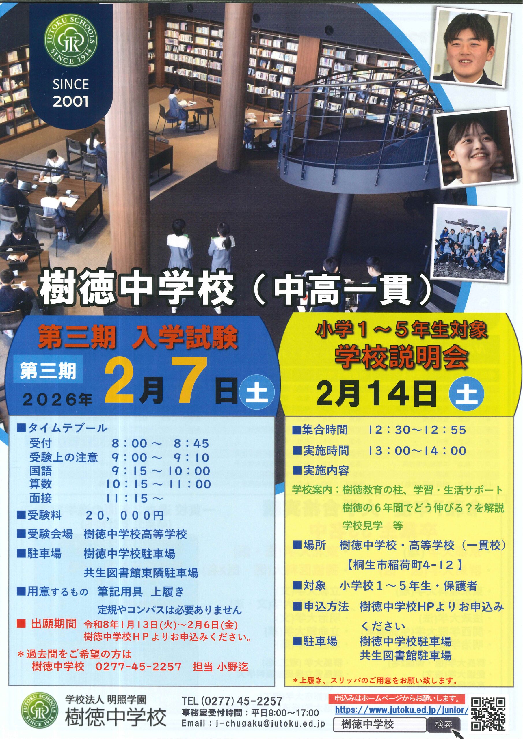 ミライコンパスのWEB上で、手続きをおすすめください。受験料20000円もミライコンパス内で納入をお願い致します。すべての手続きが終了しますと、A4サイズで、以下のように受験票、入学願書、そして樹徳中学校送付用の宛名を印刷することが出来ます。3枚に切り取り、受験票は2月7日(土)の受験日当日に持参してください。入学願書は面接票(以下よりダウンロード、プリントアウトし、手書きで記入してください)、そして小学校6年1、2学期の通知表(表・裏)のコピーと一緒に2月6日(金曜日必着)までに、封筒に宛名(A4サイズ1枚でコピーした3種類の中のうちの1つ)を貼り付け、必要書類を同封の上、樹徳中学校にお送りください。ご不明な点がございましたら、ご遠慮なく樹徳中学校までご連絡ください。(0277-45-2257)