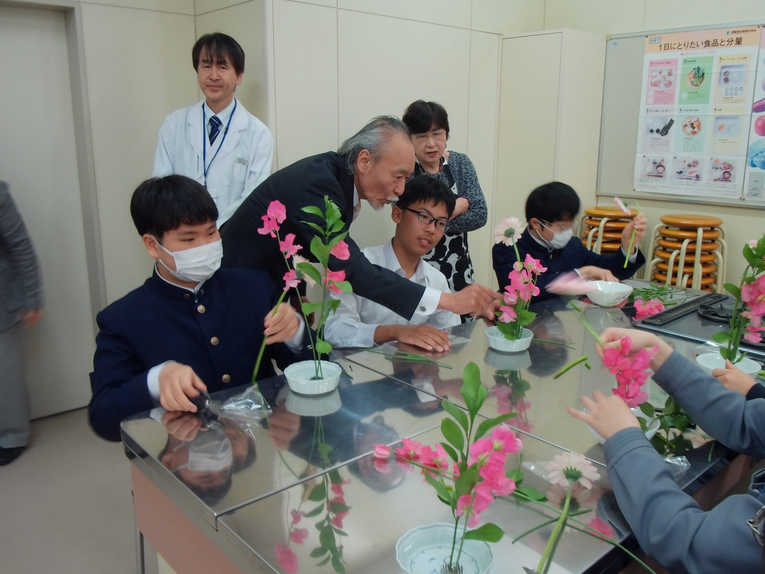 1月13日(火)2年生対象に第二回華道教室が行われました。 講師の近藤先生より、華道の心得についてお話があり、「感謝・命の大切さ・命の儚さ」について学びました。生徒たちは、スイートピー・ガーベラ・ルスカスを使って、思いをもって作品づくりに取り組みました。