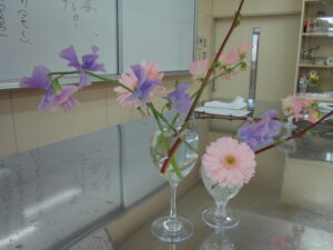 講師の近藤先生より、5節句の由来について話がありました。その後、花の生け方(立真と傾真)と色の印象について学びました。生徒たちは、想像力を駆使しながら学んだ技術を使って自分の理想の美しい形を目指して花を生けていました。使用したのは木苺、スイトピー(ピンク、紫)、ガーベラで春の到来を感じさせます。次回は立志式の式場の舞台に飾る花を合作で生けるので、生徒は楽しみにしています。