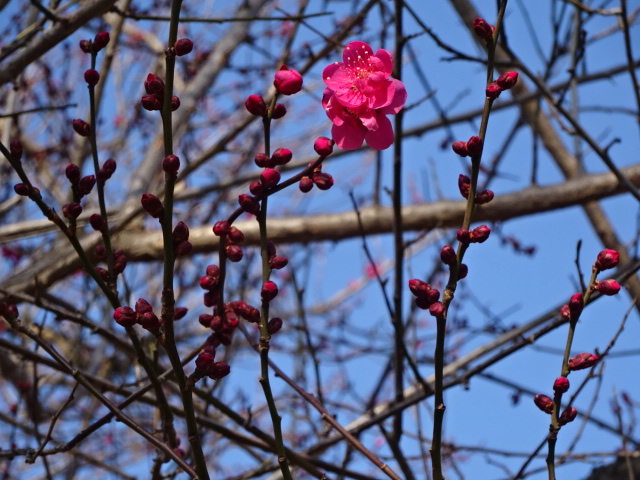 我が家の梅のつぼみ、一輪咲きました。
