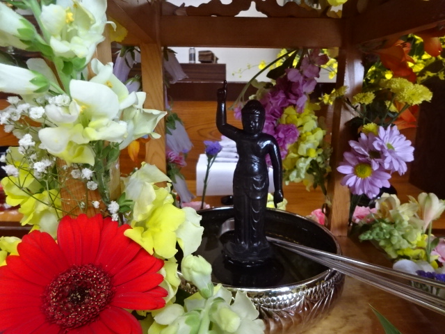 花祭りは生徒が花一輪持参して花御堂(お釈迦様の赤ちゃんの像が収まっている小さなお堂)に供えられます。
